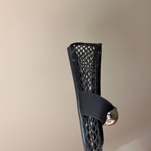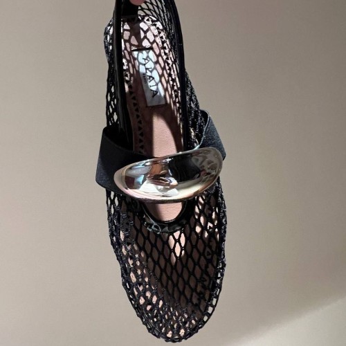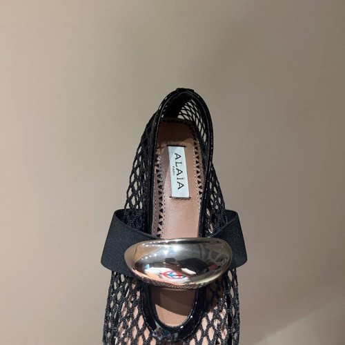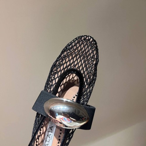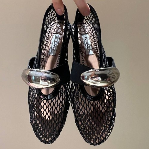 Черные балетки в сетку от Alaia из текстиля. Удобная плоская подошва с закругленным носом придаст вашей походке легкость. Серебряная накладка на резинке в виде декора украшает данную модель балеток. Идеальная пара обуви на теплое время года. В нашем интернет-магазине вы можете купить копии балеток с доставкой по Москве и по всей России.