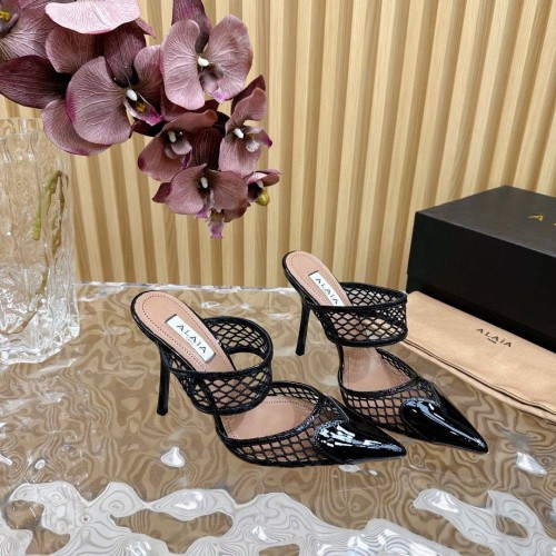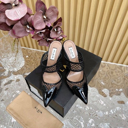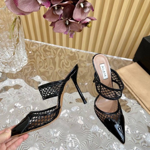 Черные женские босоножки от Alaia из лакированной кожи и сетки. Модель босоножек Кер, названные в честь аппликаций в форме сердечек. Тонкий высокий каблук 10,5 визуально сделает ваши ноги стройнее. Модель с закрытым острым носом. В нашем интернет-магазине вы можете купить копии босоножек с доставкой по Москве и по всей России.