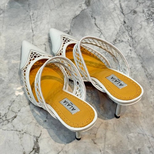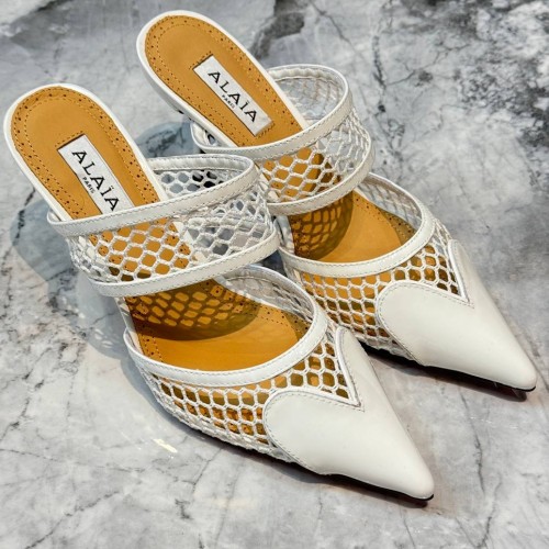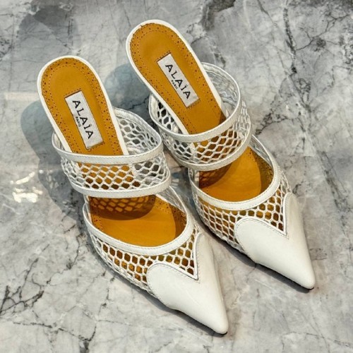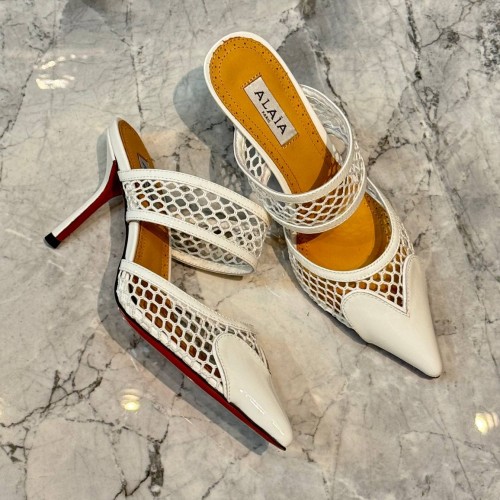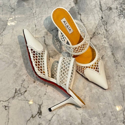 Белые женские босоножки от Alaia из лакированной кожи и сетки. Модель на устойчивом каблуке высотой 10,5 см дополнили аппликацией в виде сердечек. Яркие босоножки внесут завершающий штрих в ваш неповторимый образ и заявят о вкусе. В нашем интернет-магазине вы можете купить копии босоножек с доставкой по Москве и по всей России.