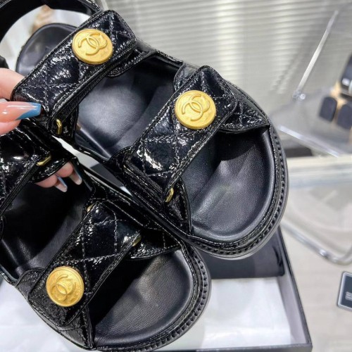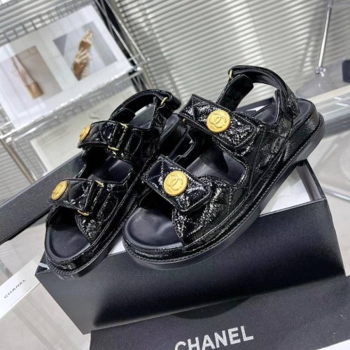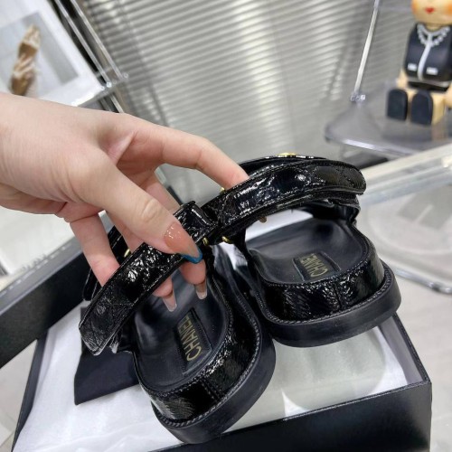 Черные босоножки Chanel из лакированной кожи со стелькой из натуральной кожи. Невероятно практичная и удобная модель с эргономичной стелькой уже который сезон находится на вершинах всех хит-парадов обуви. Приобретя эту пару вы точно не прогадаете с выбором. В нашем интернет-магазине вы можете купить копии босоножек с доставкой по Москве и по всей России.