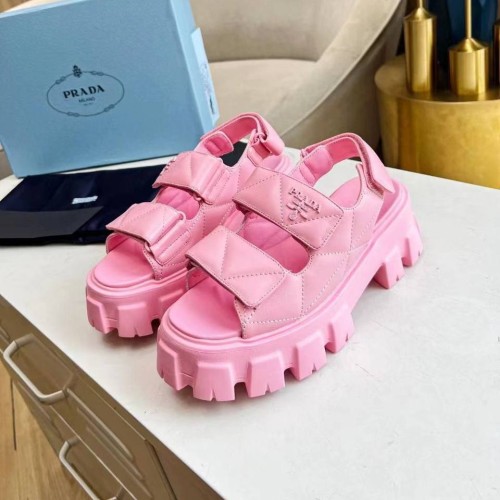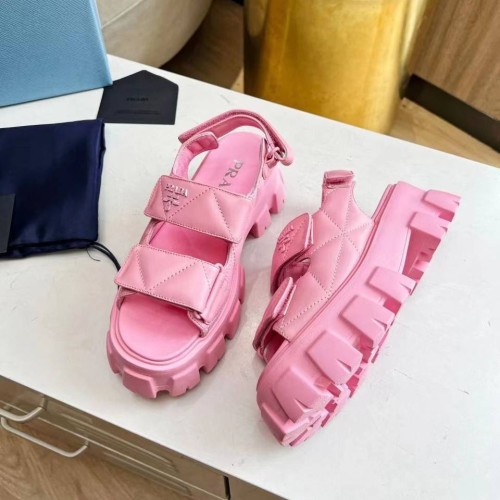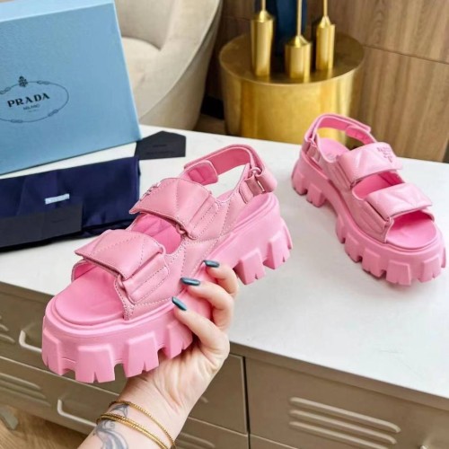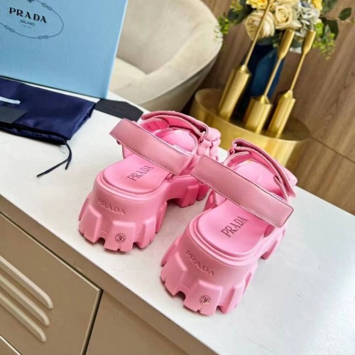 Розовые босоножки Prada из натуральной кожи. Яркие босоножки делает максимально комфортными массивная танкетка с ортопедической стелькой, а эффектными - материал. Выразительно смотрятся застежки на липучках. Они позволяют регулировать размер и полноту, что обеспечивает идеальную посадку на ноге. В нашем интернет-магазине вы можете купить копии босоножек с доставкой по Москве и по всей России.