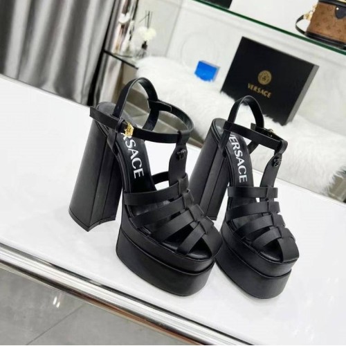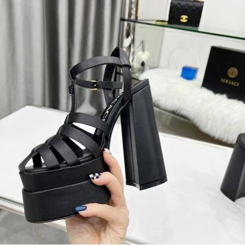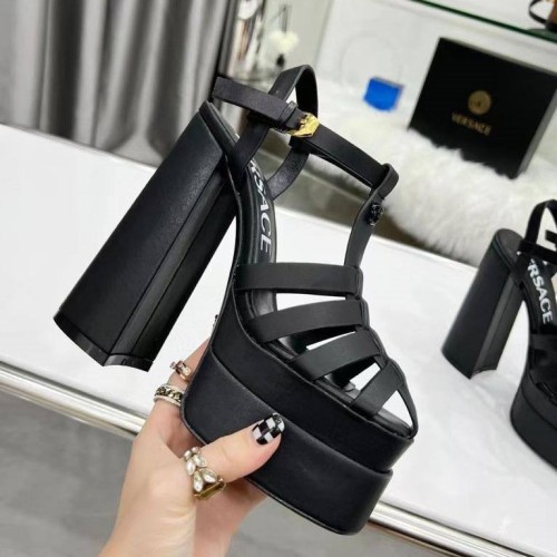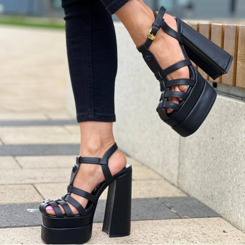 Черные босоножки Versace из натуральной кожи. Станут роскошным акцентом в вашем образе. Высокий устойчивый каблук и массивная платформа завершают дизайн. В нашем интернет-магазине вы можете купить копии босоножек с доставкой по Москве и по всей России.