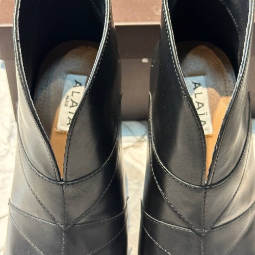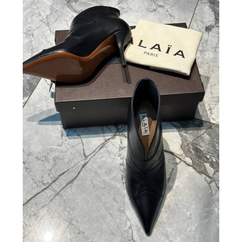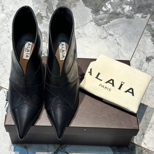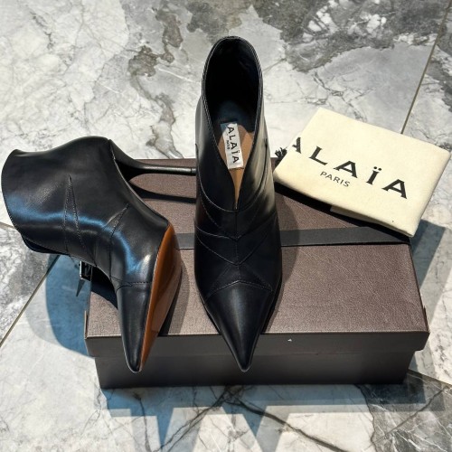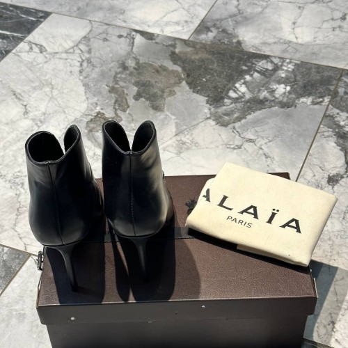Черные женские ботильоны Alaia из натуральной кожи. Женственные ботильоны легко представить на вечеринках, дневных прогулках и даже деловых переговорах. Заостренная носочная часть и каблук - шпилька, высотой 9 см - элементы дизайна, усиливающие элегантность пары. В нашем интернет-магазине вы можете купить копии ботильон с доставкой по Москве и по всей России.