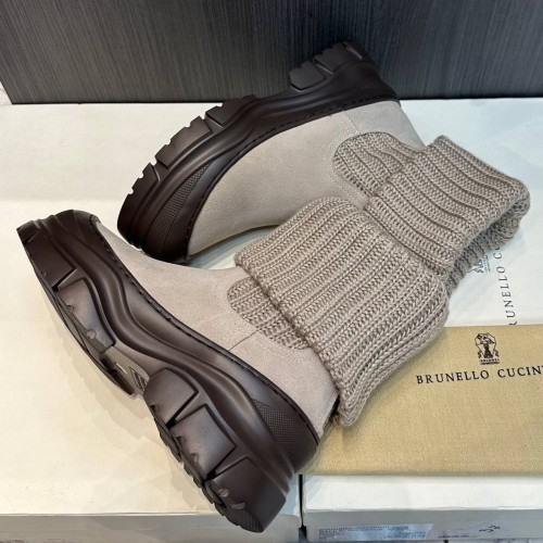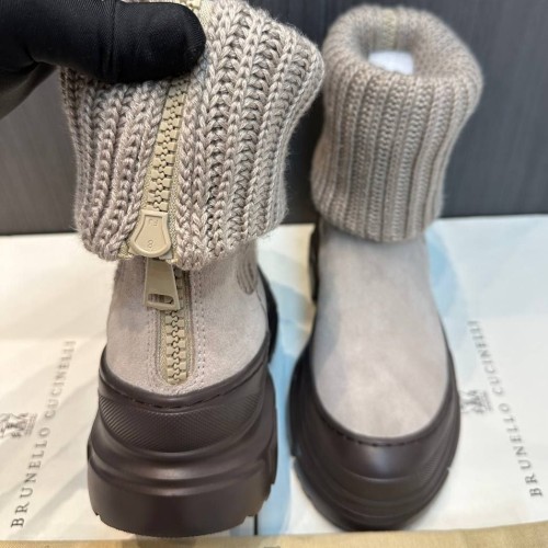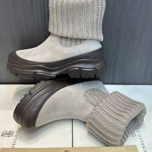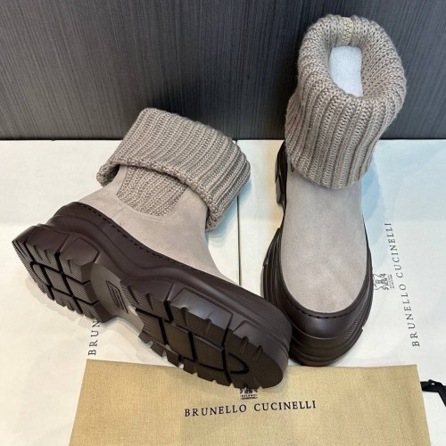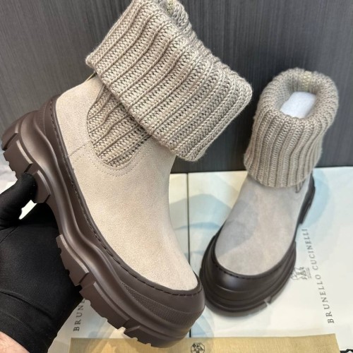 Стильные бежевые ботинки Brunello Cucinelli выполнены из натуральной мягкой замши и шерсти. Массивная резиновая подошва не пропускает холод од земли и устойчива на любых поверхностях. Шерстяной носок мягко облегает ногу и дарит тепло. Ваши ноги останутся в тепле и сухости при любой погоде. В нашем интернет-магазине вы можете купить копии ботинок с доставкой по Москве и по всей России.