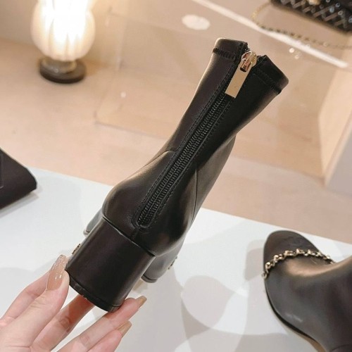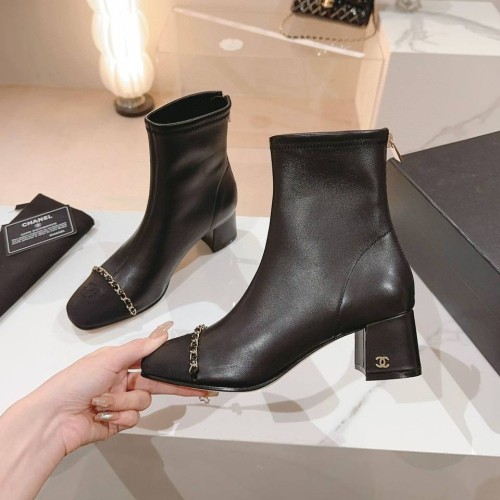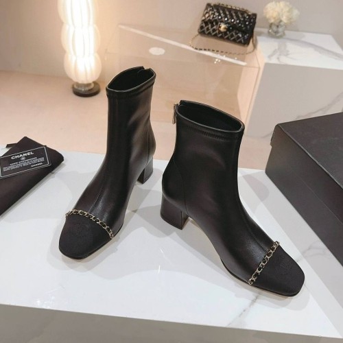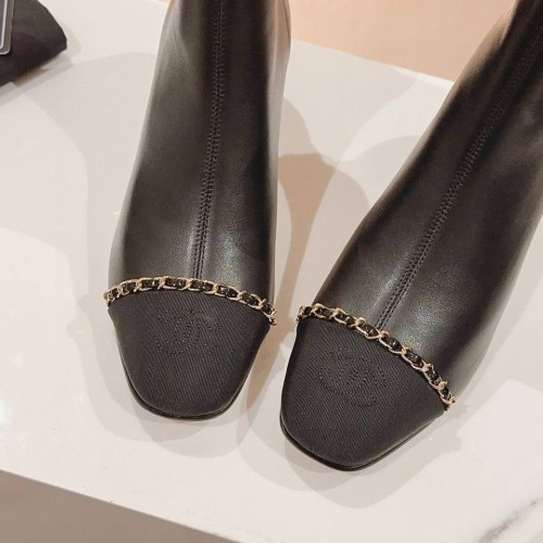 Стильные черные женские ботинки от Chanel выполнены из высококачественной натуральной кожи. Элегантные ботинки декорированы золотой цепочкой и логотипом на носке, сзади имеется молния. Высота каблука 5,5 см. В нашем интернет-магазине вы можете купить копии ботинок с доставкой по Москве и по всей России.