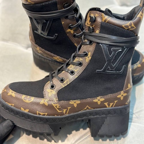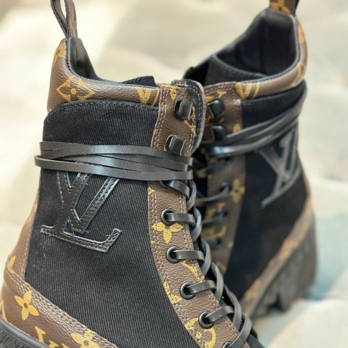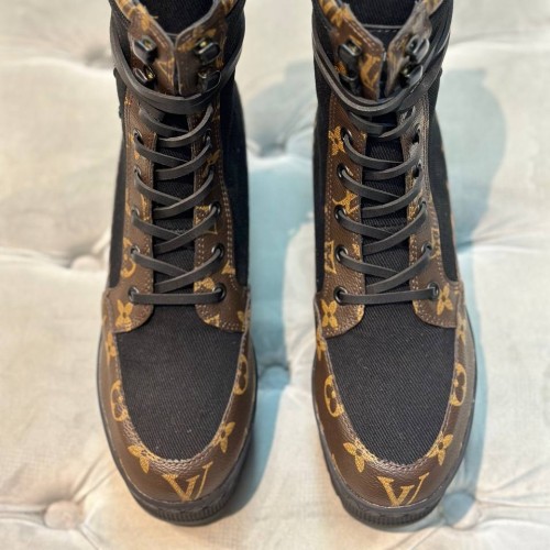Коричневые ботинки от Louis Vuitton из натуральной кожи и текстиля. Удобные и стильные ботинки сохранят ваши ноги в сухости и тепле в дождливые и холодные осенние дни. Монограмма бренда позволяет создавать множество внуков. В нашем интернет-магазине вы можете купить копии ботинок с доставкой по Москве и по всей России.