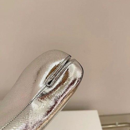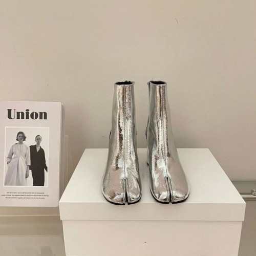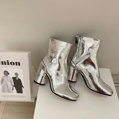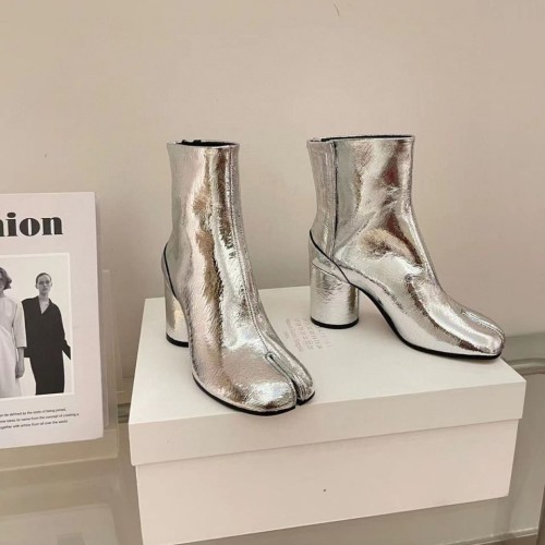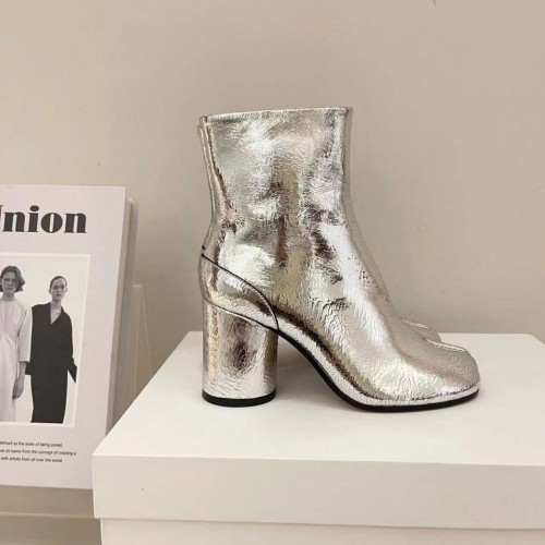 Женские серебряные ботинки Maison Margiela выполнены из натуральной гладкой кожи. Ботинки с раздвоенным мысом, как у традиционных японских носков вдохновят вас на новые луки. Изделие дополнено устойчивым круглым каблуком. В нашем интернет-магазине вы можете купить копии ботинок с доставкой по Москве и по всей России.
