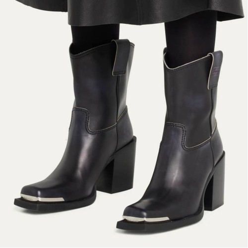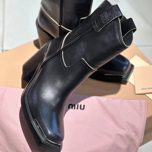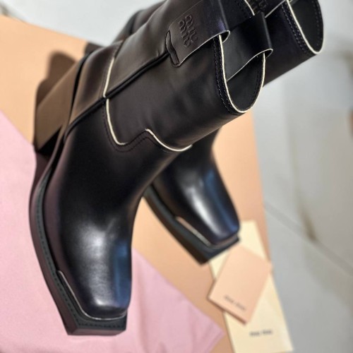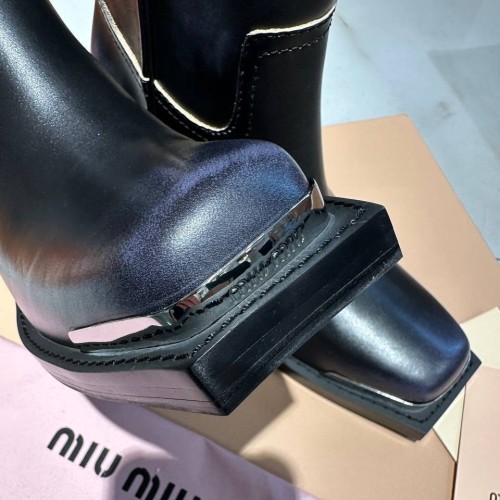 Черные ботинки Miu miu выполнены из высококачественной натуральной кожи. Ботинки в стиле вестерн с квадратным металлическим носком подчеркнут ваш вкус. Современные ботинки подходят для уверенных в себе женщин. В нашем интернет-магазине вы можете купить копии ботинок с доставкой по Москве и по всей России.