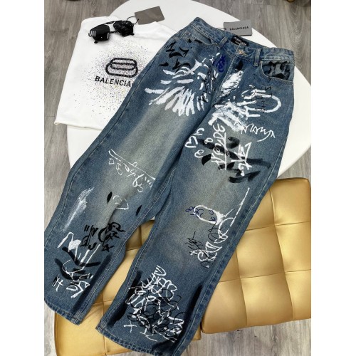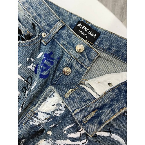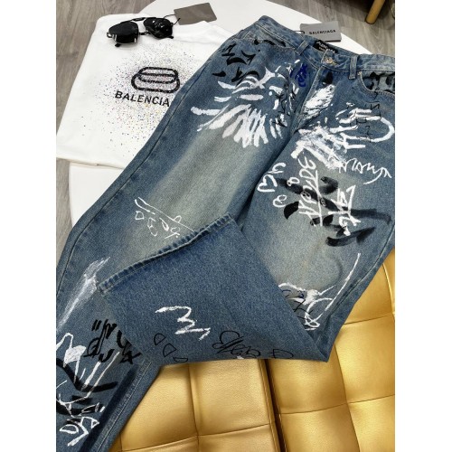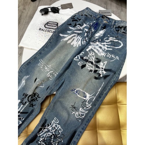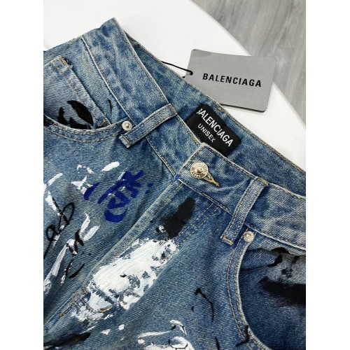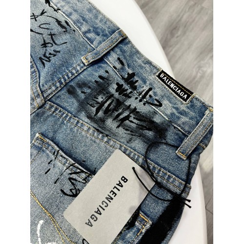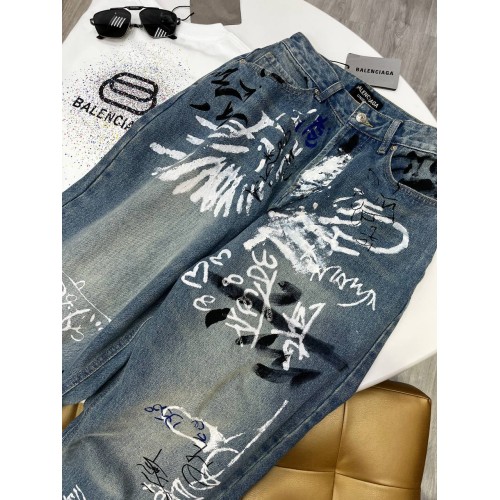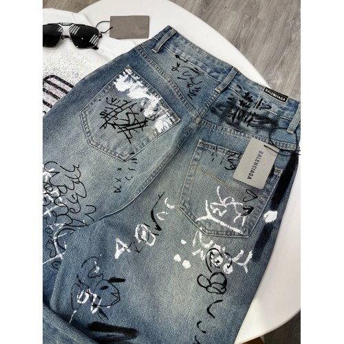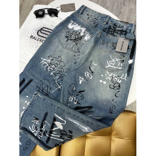 Джинсы Balenciaga синего цвета. Универсальная модель подойдет для повседневных выходов. Интересный внешний вид изделия привлекут много внимания со стороны окружающих. В нашем интернет-магазине вы можете купить копии джинсов с доставкой по Москве и по всей России.