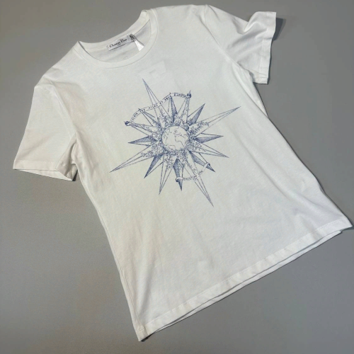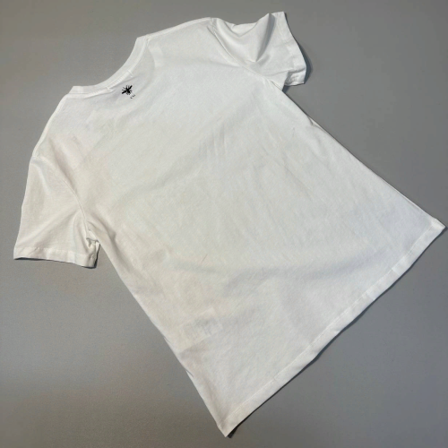 Стильная футболка Christian Dior белого цвета. Модель классического кроя с круглым вырезом дополнена фирменной эмблемой в виде пчелы и символом "CD" сзади. Футболку можно носить круглый год и сочетать с любым образом. В нашем интернет-магазине вы можете купить копии футболок с доставкой по Москве и по всей России.