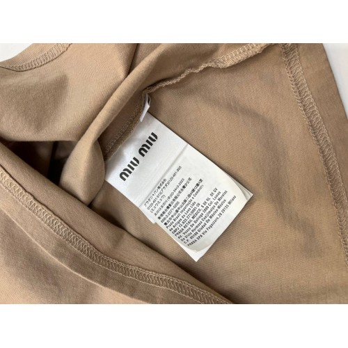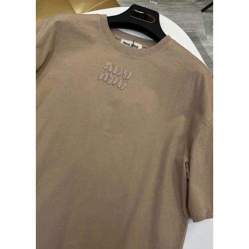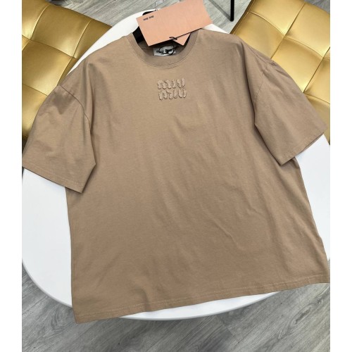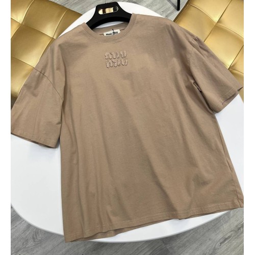 Футболка от бренда Miu Miu коричневого цвета. Футболка — универсальный элемент гардероба. Она сочетается со многими вещами. В нашем интернет-магазине вы можете купить копии футболок с доставкой по Москве и по всей России.