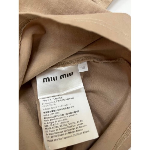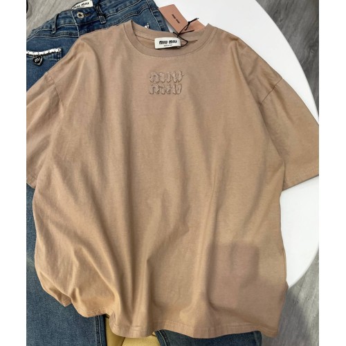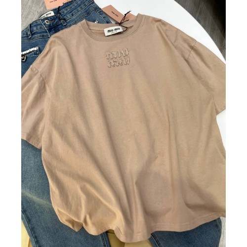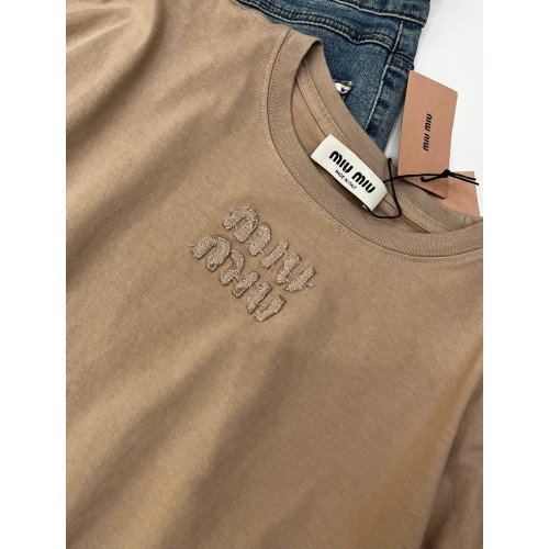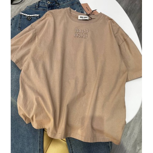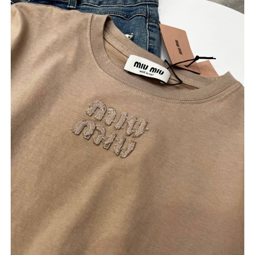 Футболка от бренда Miu Miu бежевого цвета. Футболка — обязательный атрибут в гардеробе современной женщины. Такие модели будут смотреться стильно всегда. В нашем интернет-магазине вы можете купить копии футболок с доставкой по Москве и по всей России.