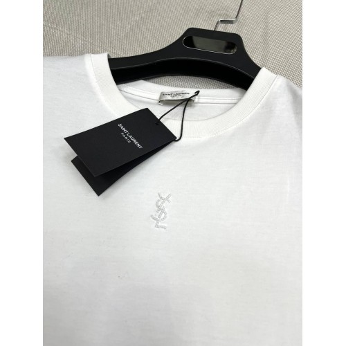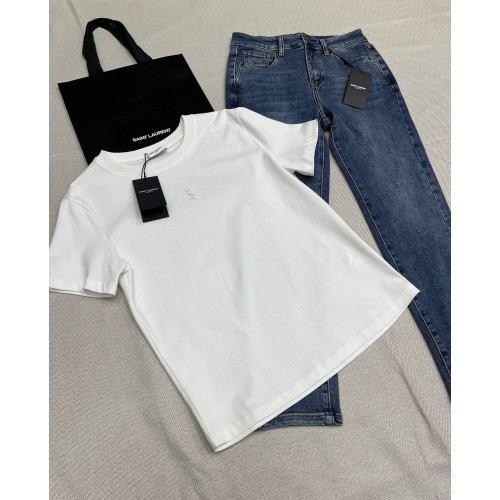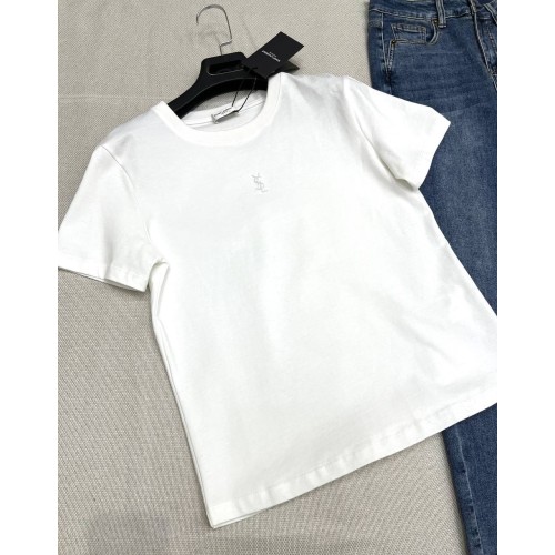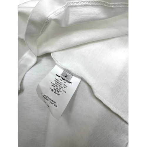 Футболка Saint Laurent белого цвета. Футболка — универсальный базовый элемент гардероба. Она сочетается со многими вещами. В нашем интернет-магазине вы можете купить копии футболок с доставкой по Москве и по всей России.