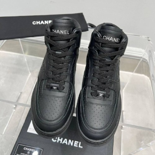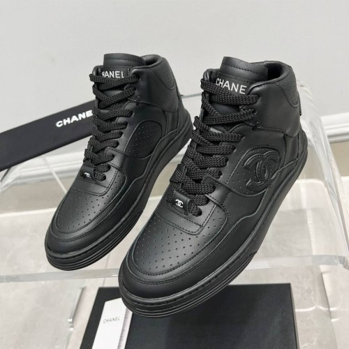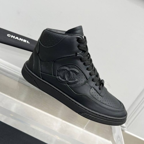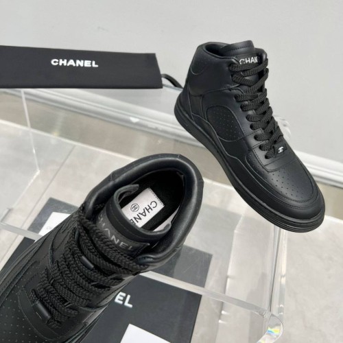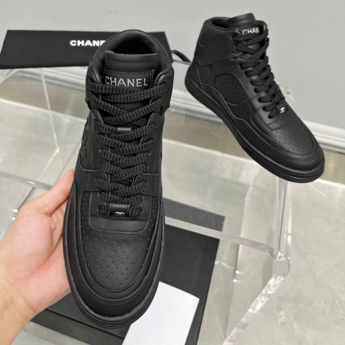 Черные высокие кеды Chanel выполнены из натуральной кожи. Модные кеды идеальная обувь для занятий спортом и прогулок. Удобная шнуровка позволяет с легкостью одевать и снимать обувь. Подошва дает надежное сцепление с поверхностью. На боковых поверхностях кед логотип бренда. В нашем интернет-магазине вы можете купить копии кед с доставкой по Москве и по всей России.