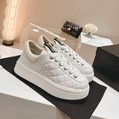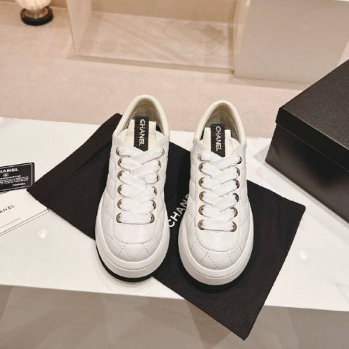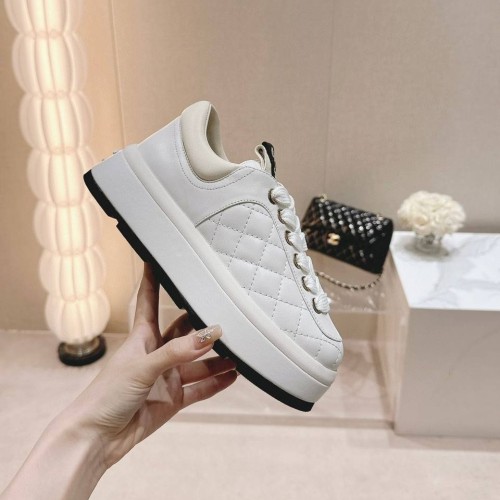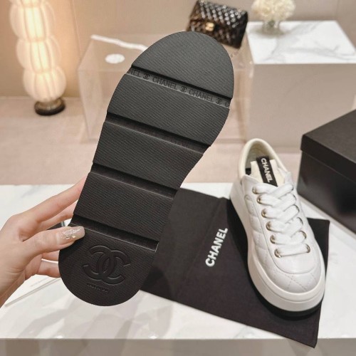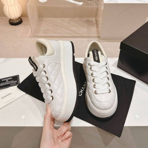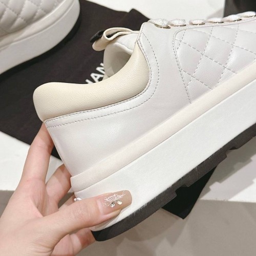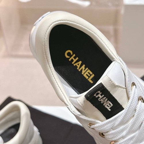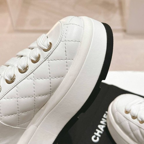 Белые женские кеды Chanel из натуральной кожи. Модные кеды на платформе идеально завершат ваш спортивный образ. Удобная колодка и мягкая стелька в сочетании с устойчивым супинатором, который равномерно распределяет нагрузку при ходьбе, позволит вам комфортно провести весь день на ногах. В нашем интернет-магазине вы можете купить копии кед с доставкой по Москве и по всей России.