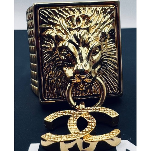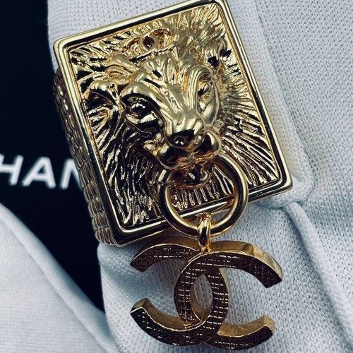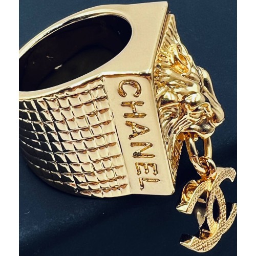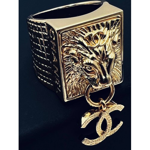 Золотое кольцо Chanel из ювелирного сплава. Эксклюзивный перстень выполнен в виде головы льва, царя зверей и украшен логотипом бренда. Аксессуар для уверенных в себе женщин. В нашем интернет-магазине вы можете купить копии колец с доставкой по Москве и по всей России.