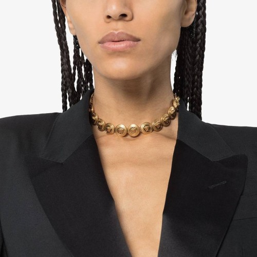 Золотое колье Versace из латуни с декором Medusa. Один из самых известных премиальных брендов, который обладает своим неповторимым стилем - обилием принтов в стиле древнегреческой мифологии. Изображение медузы уже стало одним из самых узнаваемых символов. В нашем интернет-магазине вы можете купить копии колье с доставкой по Москве и по всей России.