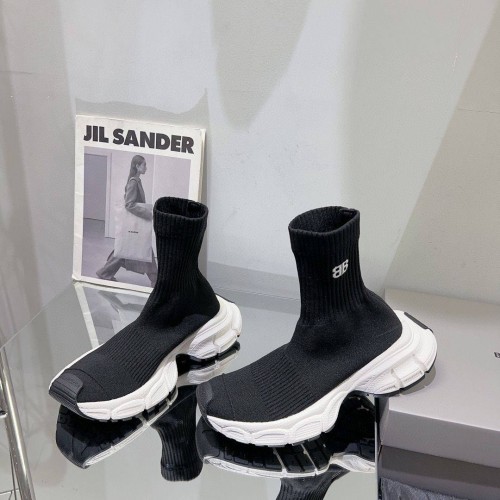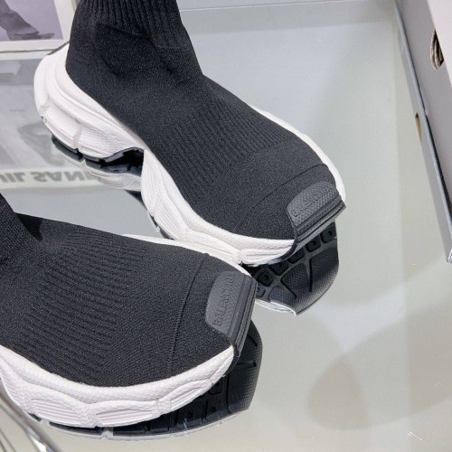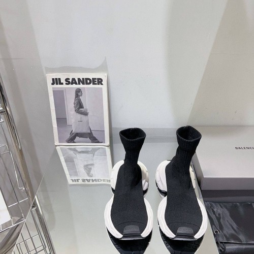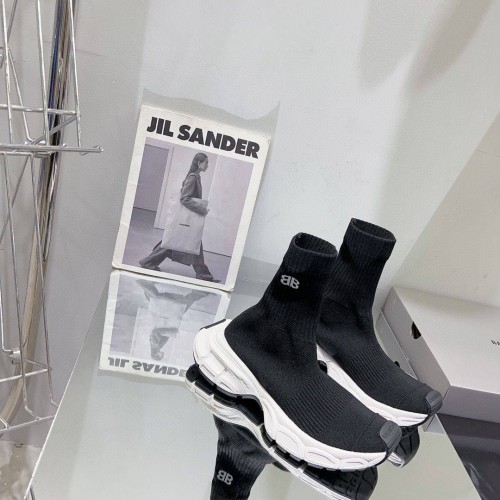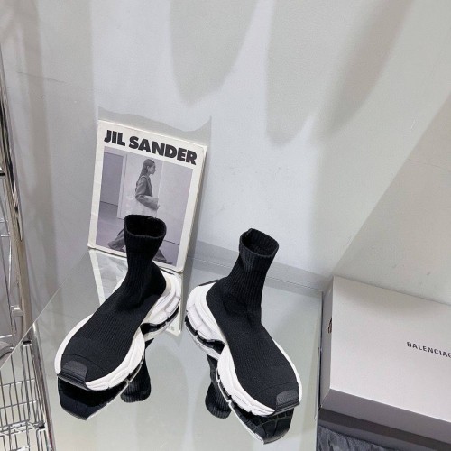 Черные женские текстильные кроссовки Balenciaga на белой подошве - модель 2023-2024 года. Кроссовки, напоминающие носок выглядят стильно и очень удобны в носке. Сплошная подошва устойчива на любых поверхностях. В нашем интернет-магазине вы можете купить копии кроссовок с доставкой по Москве и по всей России.