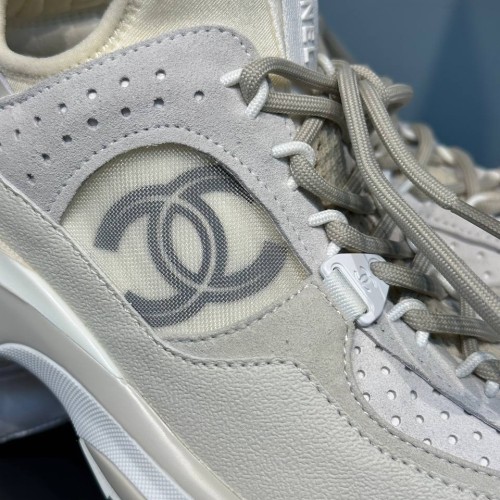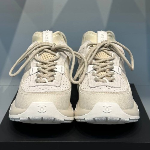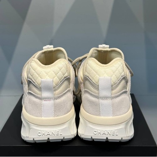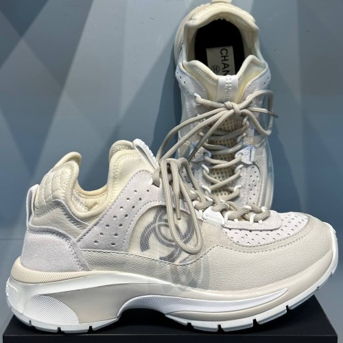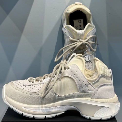 Белые кроссовки от Chanel с бежевыми вставками из натуральной замши и кожи. Кроссовки из комбинированных материалов подарят вам безупречный комфорт и поддержку в течение всего дня благодаря усовершенствованной амортизации и анатомически правильной посадке. Гибкая массивная подошва устойчива на любых поверхностях. В нашем интернет-магазине вы можете купить копии кроссовок с доставкой по Москве и по всей России.