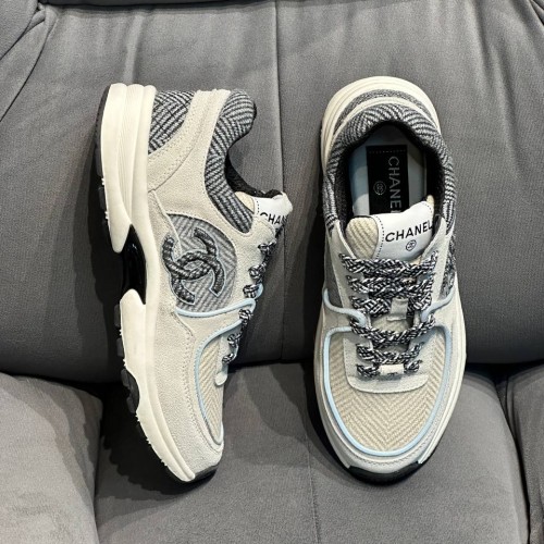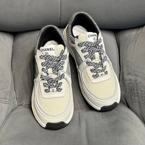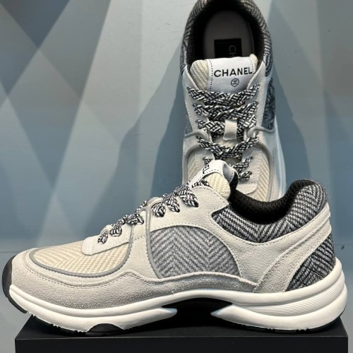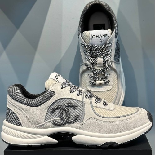 Стильные бежево-серые кроссовки от Chanel из натуральной мягкой замши и твида. Кроссовки из комбинированных материалов подарят вам поддержку в течение всего дня благодаря усовершенствованной амортизации и анатомически правильной посадке. Удобная шнуровка позволяет быстро одевать обувь. В нашем интернет-магазине вы можете купить копии кроссовок с доставкой по Москве и по всей России.