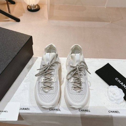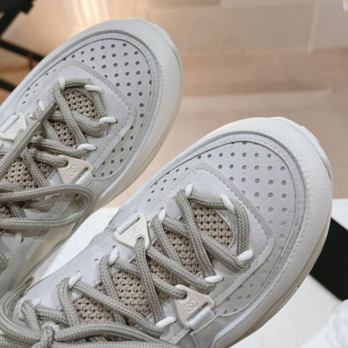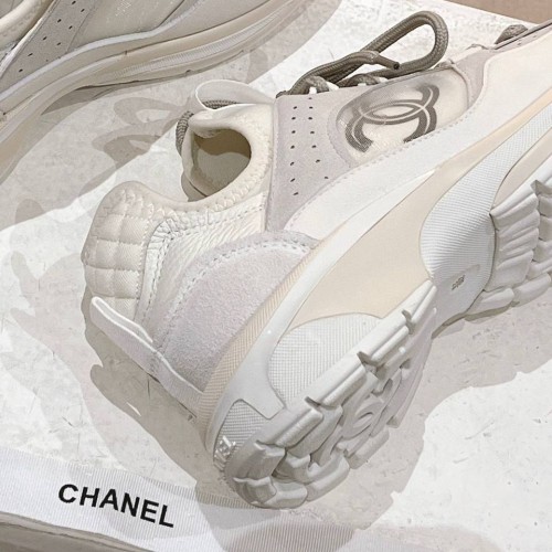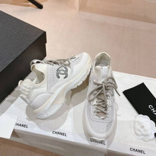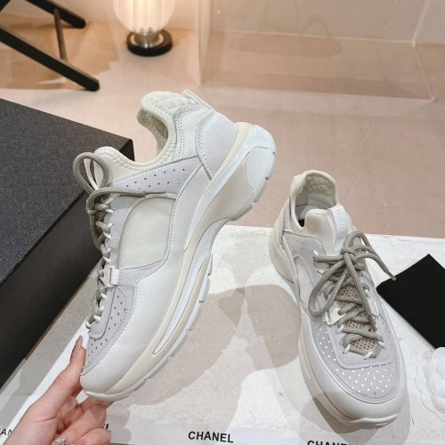 Бело-серые женские кроссовки от Chanel из натуральной кожи и мягкой замши. Стильные кроссовки станут фаворитом в вашем гардеробе. Удобная шнуровка позволяет быстро и легко одевать обувь. В нашем интернет-магазине вы можете купить копии кроссовок с доставкой по Москве и по всей России.