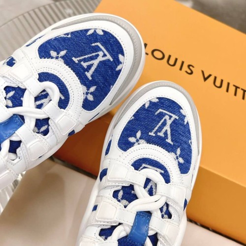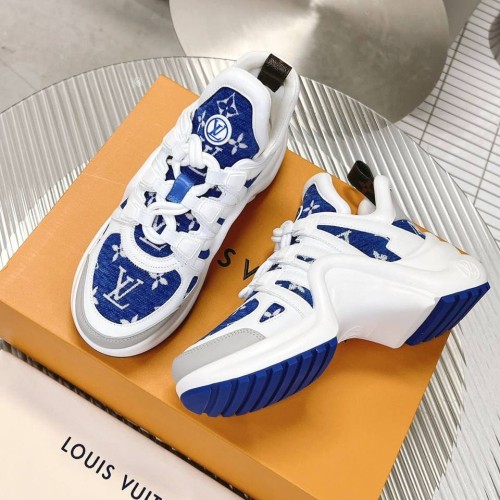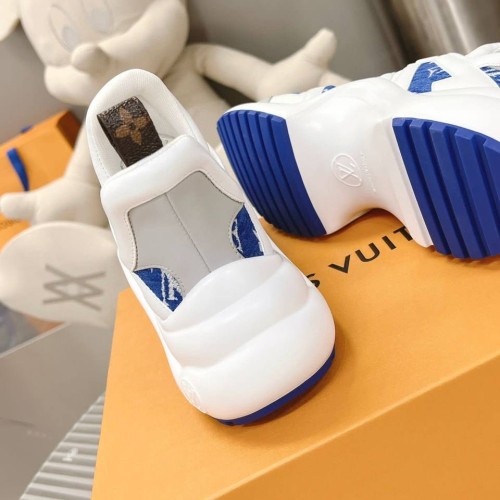 Белые женские кроссовки от Louis Vuitton Archlight из высококачественной натуральной кожи. Классные синие вставки с инициалами бренда подчеркивают стиль изделия. Дизайнерская обувь в новом исполнении. В нашем интернет-магазине вы можете купить копии кроссовок с доставкой по Москве и по всей России.