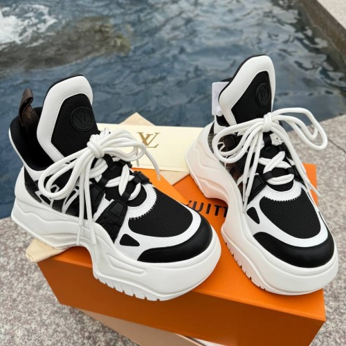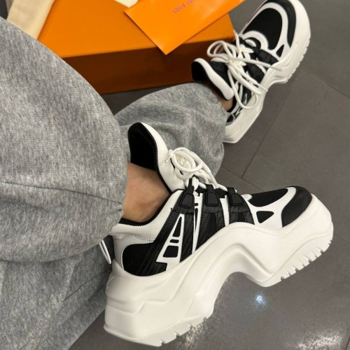 Бело-черные кроссовки от Louis Vuitton с из натуральной кожи и текстиля. Эта модная версия кроссовок отличается графической объемной подошвой 5 см и увеличенным язычком, подписанным логотипом LV. Хороший выбор для создания оригинального образа. Модель отлично подойдет для прогулок, обеспечивая максимум комфорта в течение всего дня. В нашем интернет-магазине вы можете купить копии кроссовок с доставкой по Москве и по всей России.