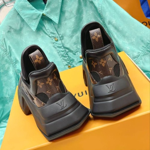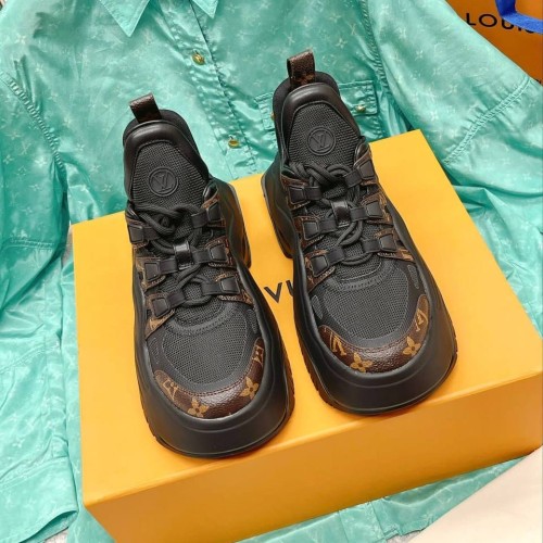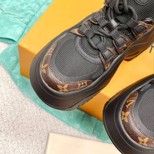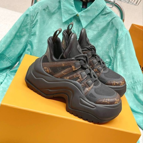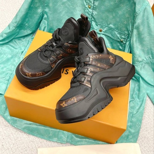 Черные кроссовки от Louis Vuitton Archlight с коричневыми вставками из натуральной кожи и канвы. Кроссовки имеют высокую изогнутую подошву, удлиненный язычок, монограмму бренда и петлю на задники для легкого одевания обуви. Модель дополнена текстильными шнурками. В нашем интернет-магазине вы можете купить копии кроссовок с доставкой по Москве и по всей России.