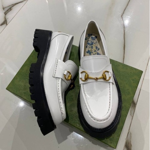 Белые лоферы Gucci из натуральной кожи. Практичные лоферы на черной платформе с устойчивым каблуком, в этой обуви будет комфортно чувствовать себя как подросток, так и взрослая женщина. Эта пара изготовлена из натуральной кожи и украшена фирменной пчелкой бренда Gucci. В нашем интернет-магазине вы можете купить копии лоферов с доставкой по Москве и по всей России.