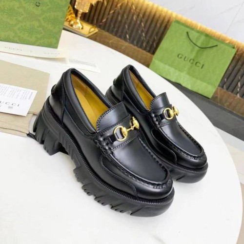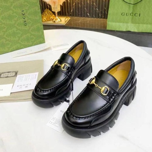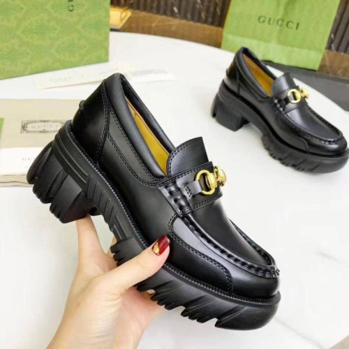 Женские из натуральной кожи черные лоферы Gucci Horsebit. Современное звучание придает модели с винтажной деталью массивная подошва. Красивое и изысканное сочетание не оставит никого равнодушным. В нашем интернет-магазине вы можете купить копии лоферов с доставкой по Москве и по всей России.