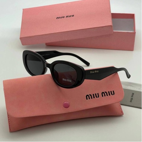 Женские черные солнцезащитные очки от Miu Miu. Коллекция 2023 года. Степень защиты от ультрафиолета UF400. Темный цвет линз добавит в Ваш образ дерзости, экстравагантности и шарма. Модный и стильный аксессуар, который дополнит любой образ. В нашем интернет-магазине вы можете купить копии очков с доставкой по Москве и по всей России.