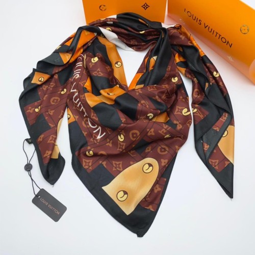 Палантин Louis Vuitton черного цвета с коричневыми, золотыми и оранжевыми вставками. Изготовлен из натурального шёлка.