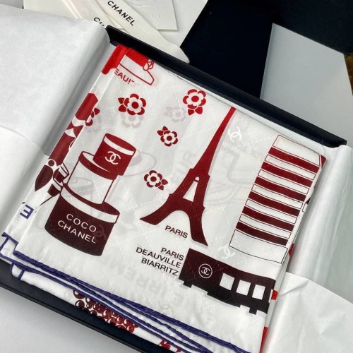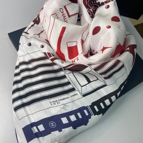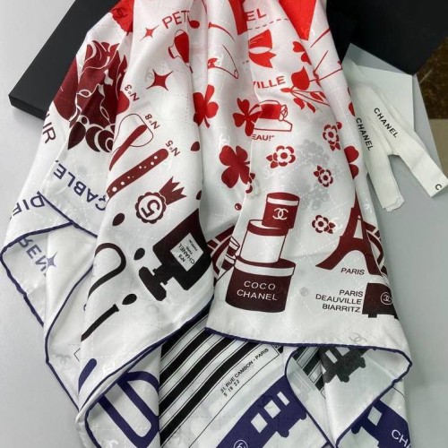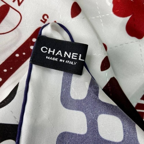 Белый платок Chanel с черными и красными геометрическими рисунками. Изготовлен из шёлка и вискозы.
