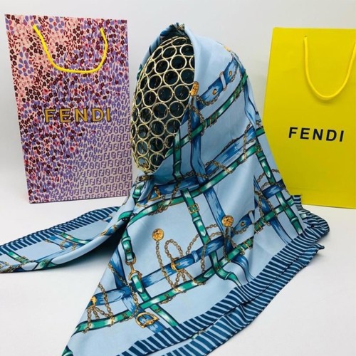 Платок Fendi голубого цвета с синими и зелеными вставками. Изготовлен из шелка.