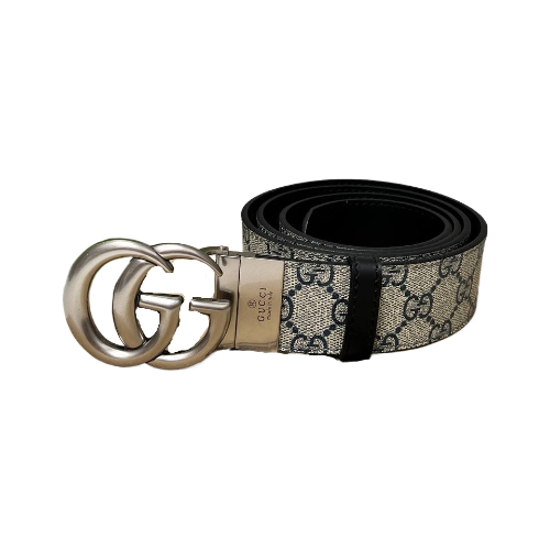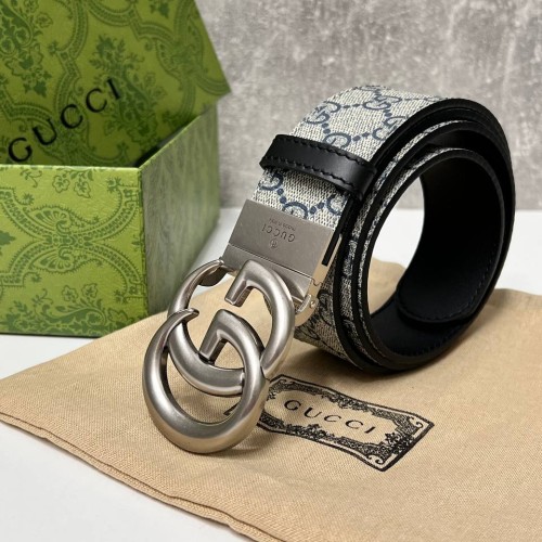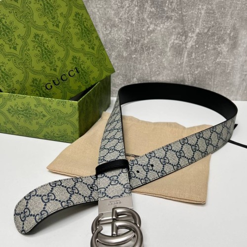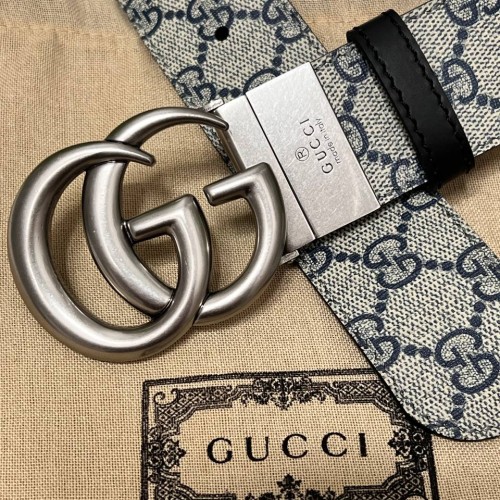 Сине-бежевый ремень Gucci из натуральной кожи. Роскошный аксессуар украшен серебристой пряжкой с двумя переплетенными буквами G. Стильная модель подойдет к любому вашему образу. В нашем интернет-магазине вы можете купить копии ремней с доставкой по Москве и по всей России.