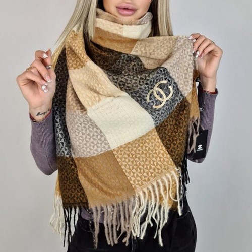 Шарф Chanel бежевого цвета с черными и коричневыми вставками. Изготовлен из кашемира и шелка.