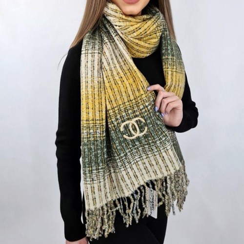 Шарф Chanel бежевого цвета с желтыми и зелеными вставками. Изготовлен из кашемира и шелка.