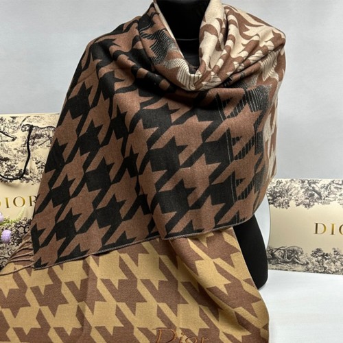 Шарф Christian Dior коричневого цвета с черными и белыми вставками. Изготовлен из кашемира и шелка.