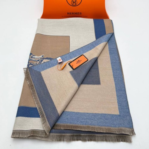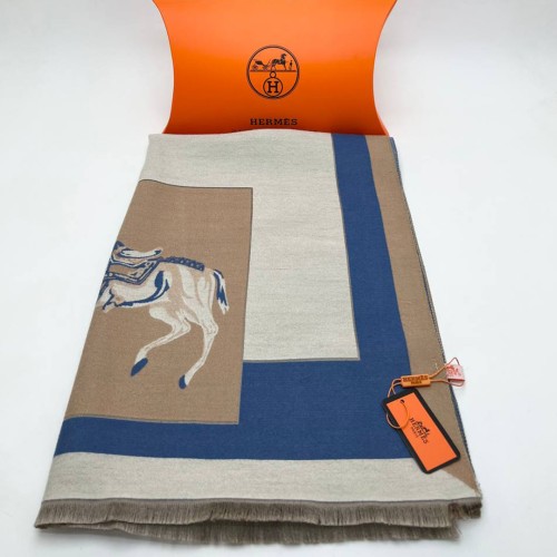 Шарф Hermes коричневого цвета с белыми и синими вставками. Изготовлен из кашемира и шелка.
