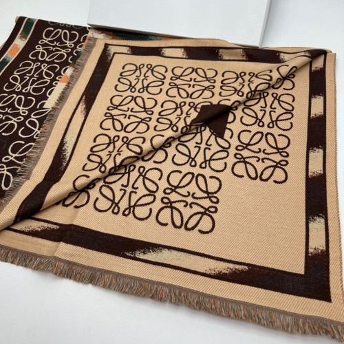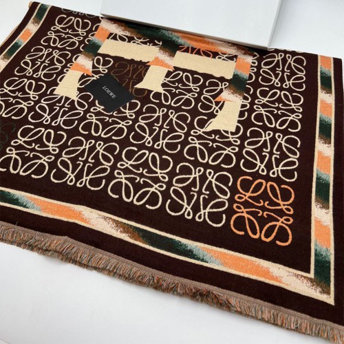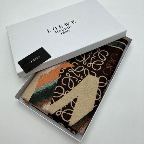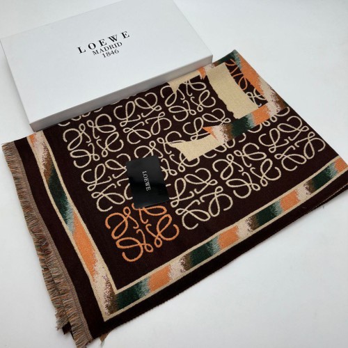 Шарф Loewe бордового цвета с бежевыми, зелеными и оранжевыми вставками. Изготовлен из кашемира и шёлка.