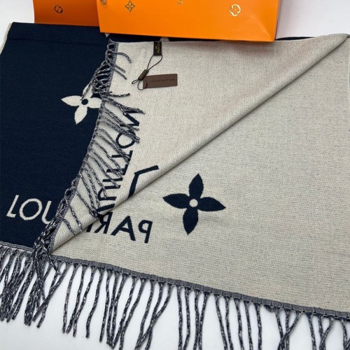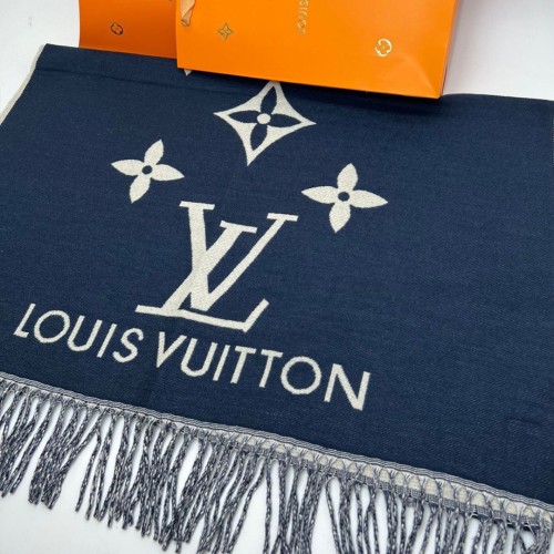 Шарф Louis Vuitton синего цвета с белыми вставками. Изготовлен из кашемира и шёлка.