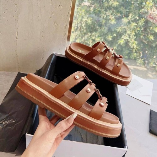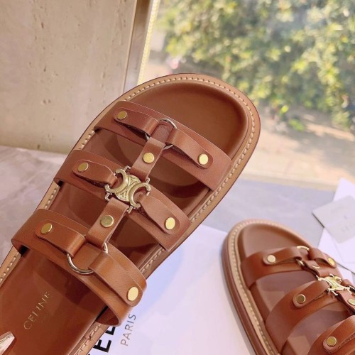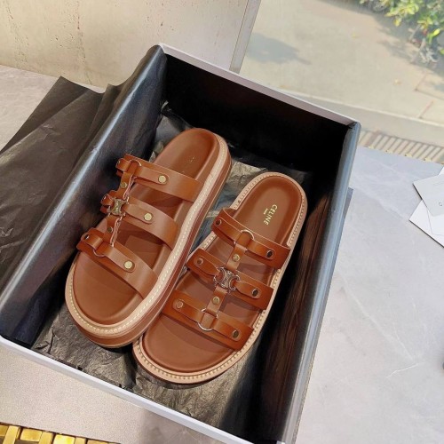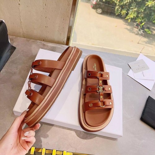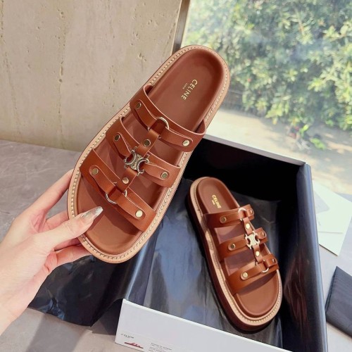 Коричневые шлепанцы от Celine из натуральной кожи. Удобные шлепанцы из весенне-летней коллекции будут одинаково уместны на прогулке и в городе, так и на морском побережье. Золотая эмблема ненавязчиво напоминает о принадлежности к марке. В нашем интернет-магазине вы можете купить копии шлёпанцев с доставкой по Москве и по всей России.