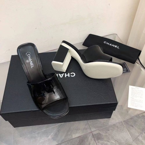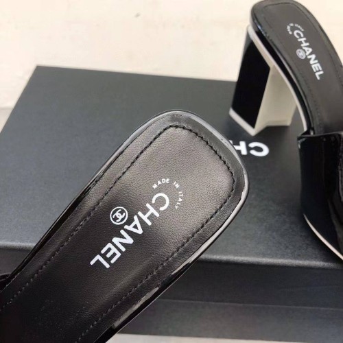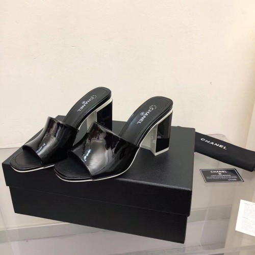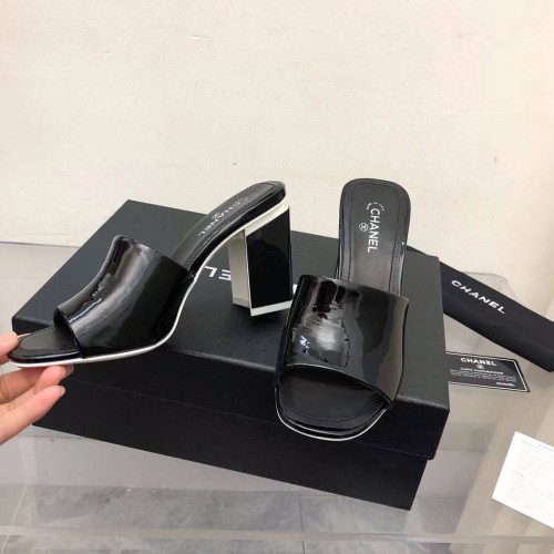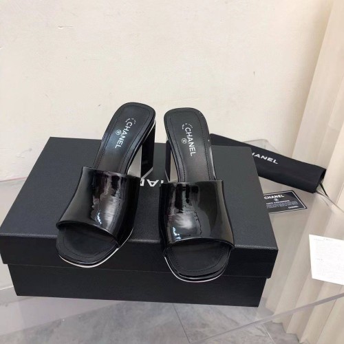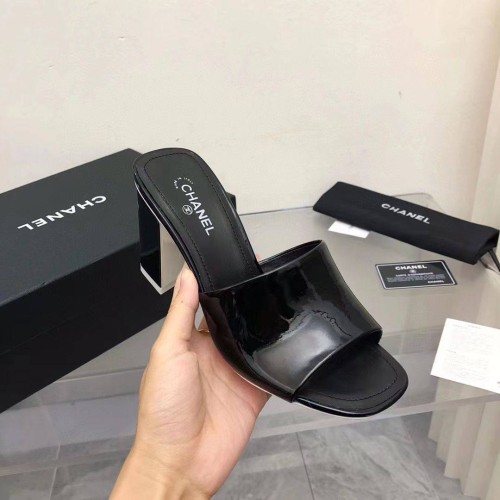 Женские шлепанцы Chanel черного цвета из лакированной кожи. Модная пара обуви на устойчивом каблуке 8,5 см внесет завершающий штрих в ваш летний образ. Идеальный вариант для тех, кто предпочитает устойчивость и комфорт. Шлепанцы обеспечивают надежную посадку и при этом смотрятся очень элегантно. В нашем интернет-магазине вы можете купить копии шлёпанцев с доставкой по Москве и по всей России.