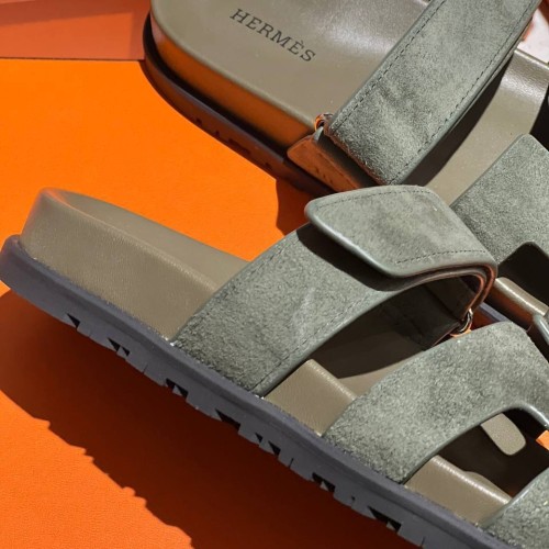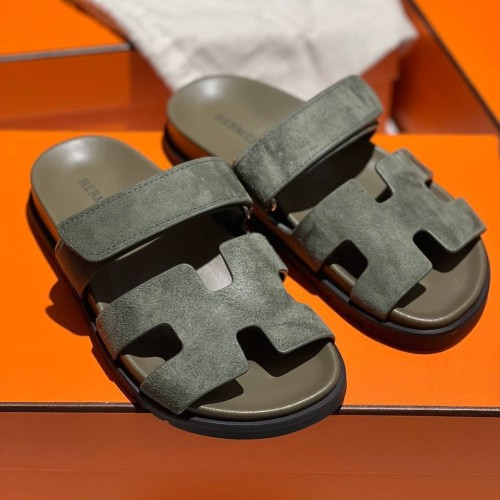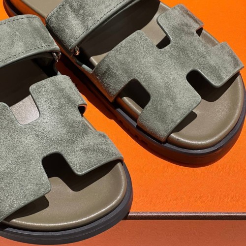 Серые женские шлепанцы от Hermes из натуральной замши. Шлепанцы Hermes с вырезом в виде легендарной буквы «H». Этот силуэт в культовом стиле Hermes является неотъемлемой частью любого гардероба и прекрасно дополнит ваш образ. В нашем интернет-магазине вы можете купить копии шлёпанцев с доставкой по Москве и по всей России.