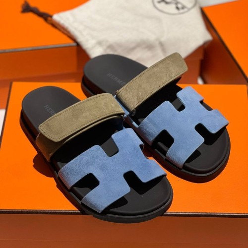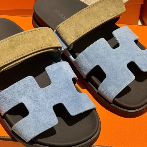 Женские шлепанцы оливкового и голубого цветов от Hermes из натуральной замши. Яркие шлепанцы органично впишутся как в городской образ, так и в непринужденный ансамбль для отдыха у моря. Удобные липучки надежно фиксируют стопу и дарят непревзойденный комфорт вашим ногам. В нашем интернет-магазине вы можете купить копии шлёпанцев с доставкой по Москве и по всей России.