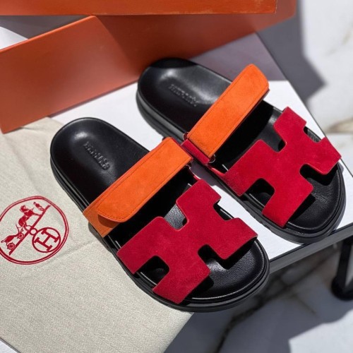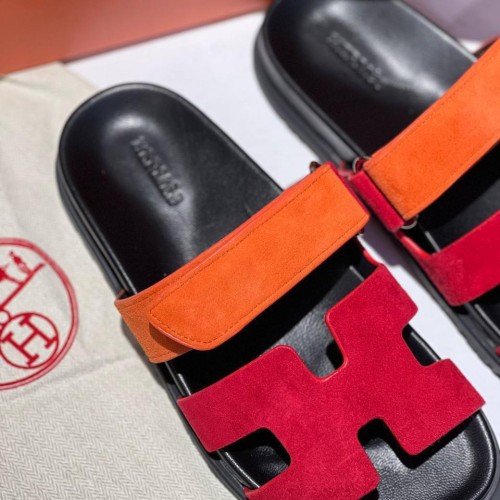 Оранжево-красные шлепанцы Hermes из натуральной замши. Эти яркие и веселые шлепанцы в состоянии поднять вам настроение одним своим видом. Застежка-липучка способствует особенному комфорту. В нашем интернет-магазине вы можете купить копии шлёпанцев с доставкой по Москве и по всей России.