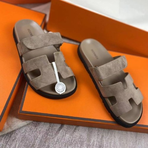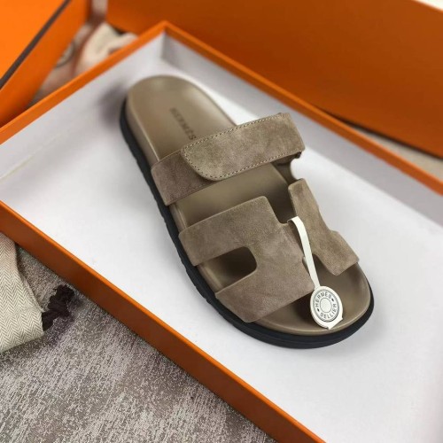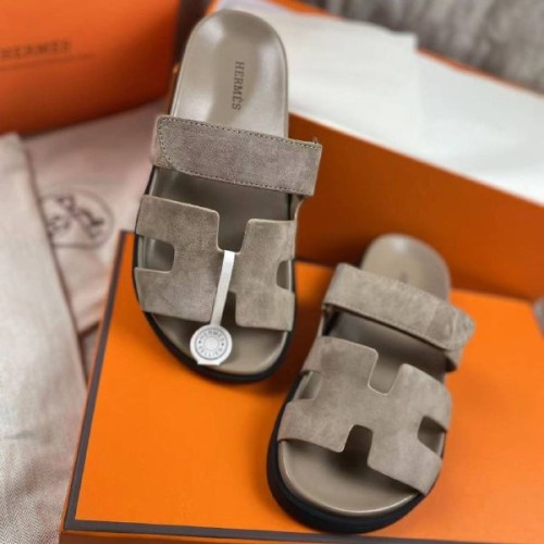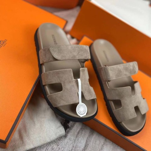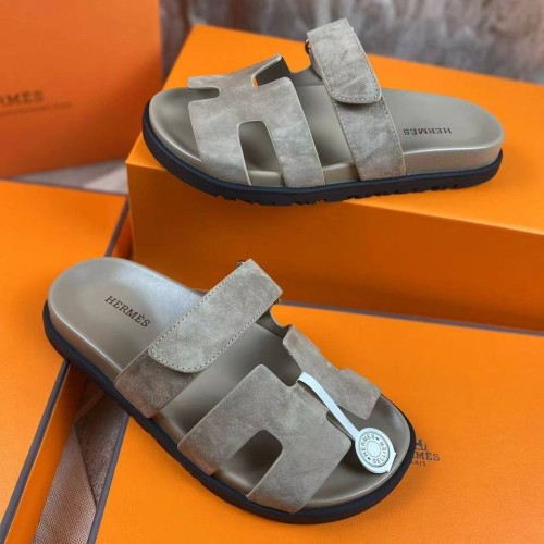 Шлепанцы от Hermes дымчатого оттенка из натуральной замши. Кожаная стелька не дает ногам потеть и чувствовать дискомфорт жарким летом. Комбинированные шлепанцы на лето идеально подойдут как для отдыха, так и для городского стиля. Удобная липучка надежно фиксирует стопу. В нашем интернет-магазине вы можете купить копии шлёпанцев с доставкой по Москве и по всей России.