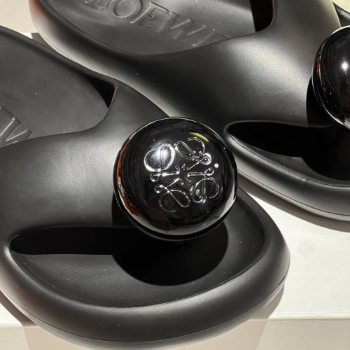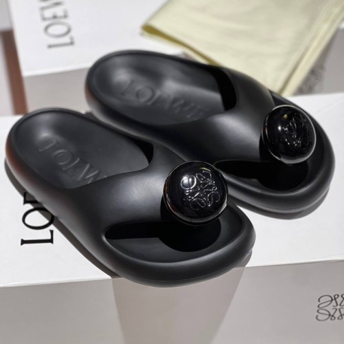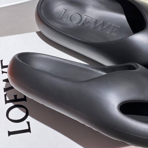 Черные женские шлепанцы Loewe из прочной резины. Шлепанцы на плоском ходу - незаменимая пара для повседневных летних образов. Модель обеспечивает плотное прилегание и надежную фиксацию. Округлая увеличенная подошва сделает каждый ваш шаг еще более устойчивым и придаст привычным образам с футболками и джинсами футуристичные мотивы. В нашем интернет-магазине вы можете купить копии шлепанцев с доставкой по Москве и по всей России.