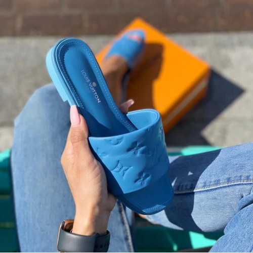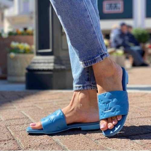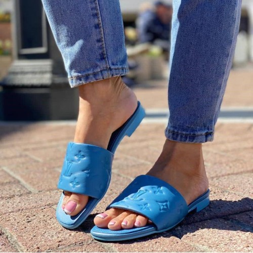 Голубые шлепанцы Louis Vuitton из натуральной кожи. Модель украшена легендарным тисненным узором Monogram. Дизайн завершают квадратный носок и удобная плоская подошва. В нашем интернет-магазине вы можете купить копии шлёпанцев с доставкой по Москве и по всей России.