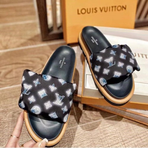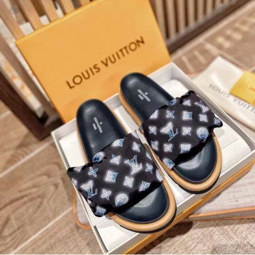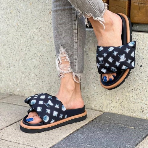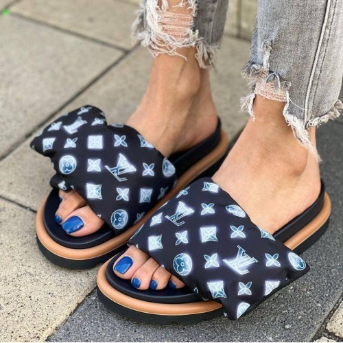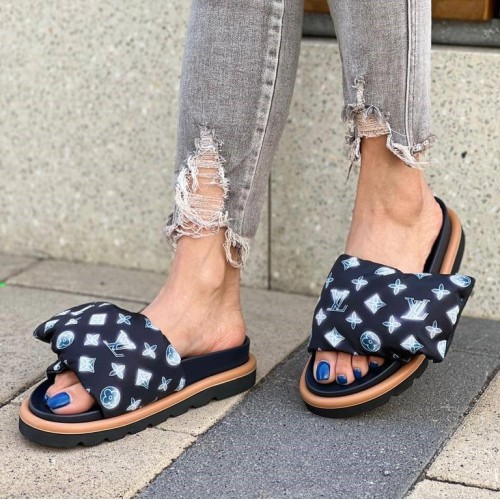 Черно-синие шлепанцы Louis Vuitton из нейлона и натуральной кожи. Удобная и стильная модель на летний сезон. Легкая, комфортная подошва завершает дизайн изделия. В нашем интернет-магазине вы можете купить копии шлёпанцев с доставкой по Москве и по всей России.